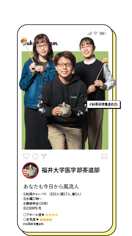 ①松岡キャンパス ②22人(医17人、看5人) ③水曜17時〜 ④暁祭茶会(10月) ⑤2,500円/月 ○アオハル度 ▶ 🌟🌟🌟🌟 ○本気度 ▶ 🔥🔥🔥🔥