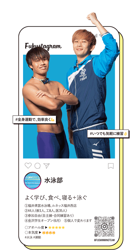 ①福井県営水泳場、ルネッス福井西店 ②44人(教1人、工8人、医35人) ③参加自由(自主練・合同練習あり) ④金沢学生オープン(6月) ⑤個人で変わります ○アオハル度 ▶ 🌟🌟🌟🌟🌟 ○本気度 ▶ 🔥🔥🔥🔥