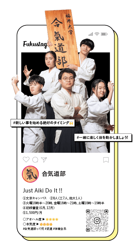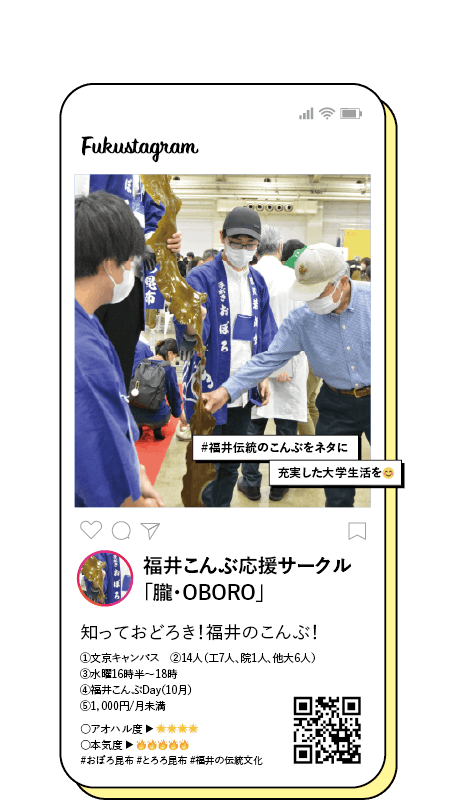 ①文京キャンパス ②14人(工7人、院1人、他大6人) ③水曜16時半〜18時 ④福井こんぶDay(10月) ⑤1,000円/月未満 ○アオハル度 ▶ 🌟🌟🌟🌟 ○本気度 ▶ 🔥🔥🔥🔥🔥