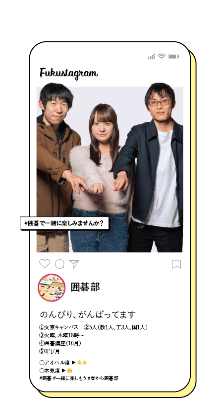 ①文京キャンパス ②5人(教1人、工3人、国1人) ③火曜、木曜18時~ ④囲碁講座(10月) ⑤0円/月 ○アオハル度 ▶ 🌟🌟 ○本気度 ▶ 🔥