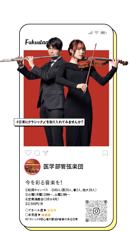 ①松岡キャンパス ②49人(医29人、看2人、他大18人) ③火曜(木曜)18時〜、土曜13時〜 ④定期演奏会(3月か4月) ⑤2,500円/月 ○アオハル度 ▶ 🌟🌟🌟 ○本気度 ▶ 🔥🔥🔥
