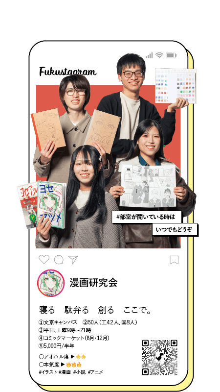①文京キャンパス ②50人(工42人、国8人) ③平日、土曜9時〜21時 ④コミックマーケット(8月・12月) ⑤5,000円/半年 ○アオハル度 ▶ 🌟🌟 ○本気度 ▶ 🔥🔥🔥