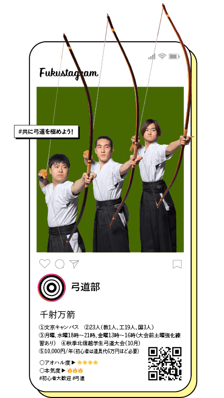 ①文京キャンパス ②23人(教1人、工19人、国3人) ③月曜、水曜18時〜21時、金曜13時〜16時(大会前土曜強化練習あり) ④秋季北信越学生弓道大会(10月) ⑤10,000円/年(初心者は道具代6万円ほど必要) ○アオハル度 ▶ 🌟🌟🌟🌟 ○本気度 ▶ 🔥🔥🔥